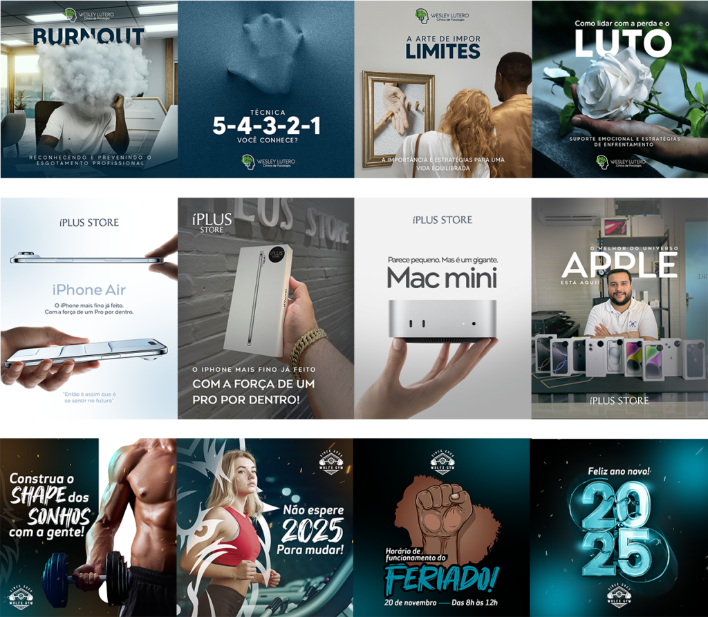 O resultado são posts profissionais, estratégicos e personalizados, criados para engajar o público certo, valorizar sua marca e apoiar seus objetivos de comunicação e marketing digital.
